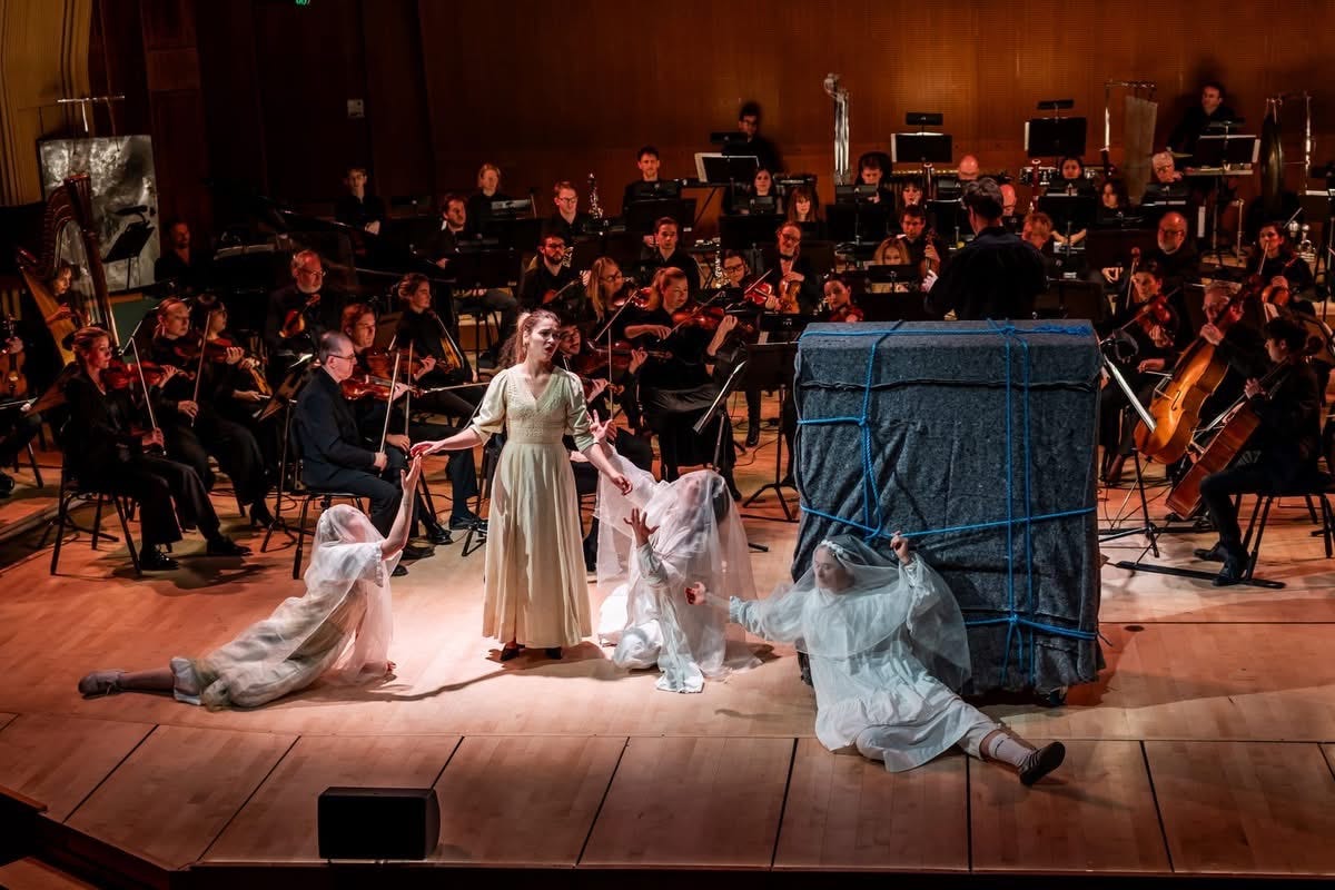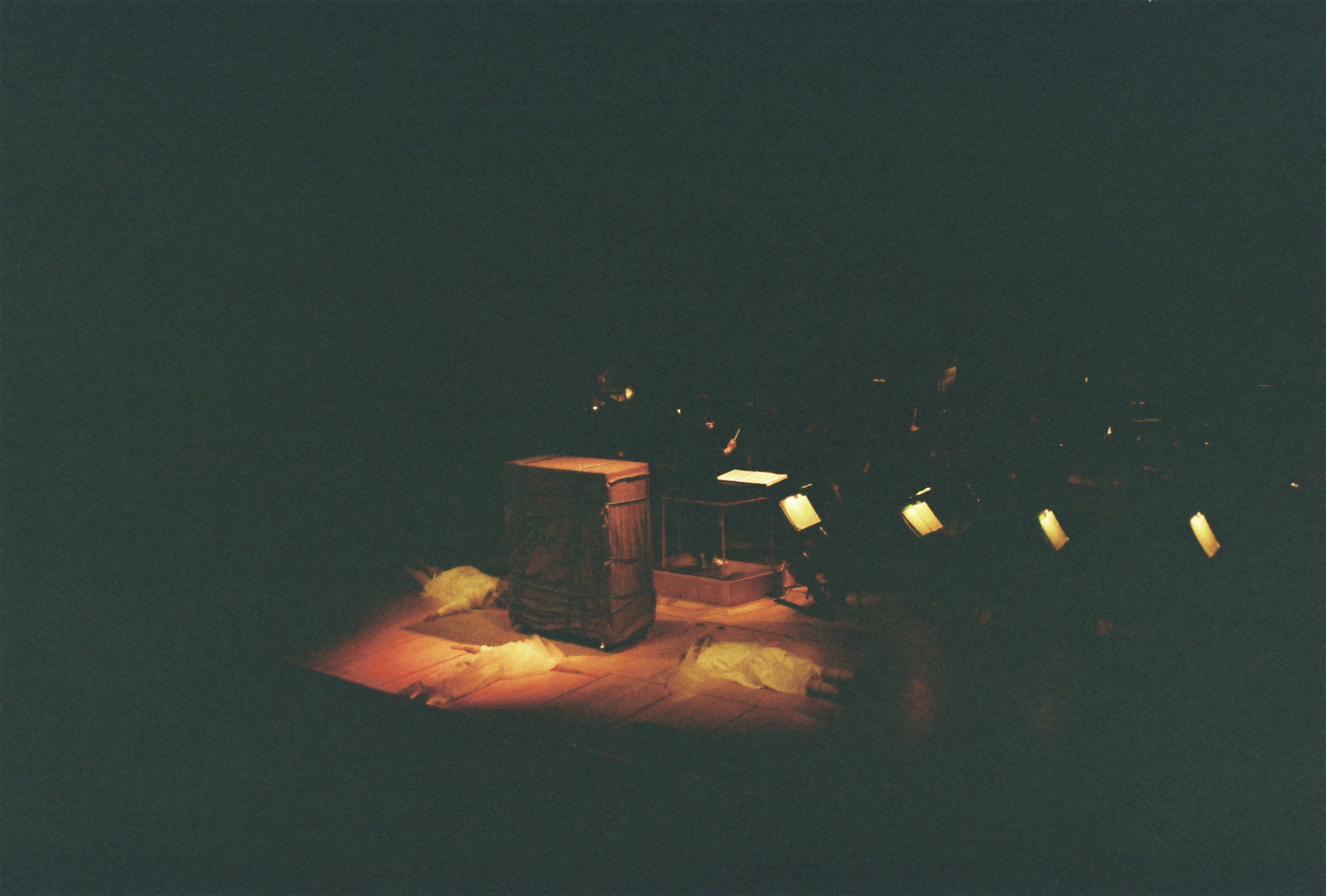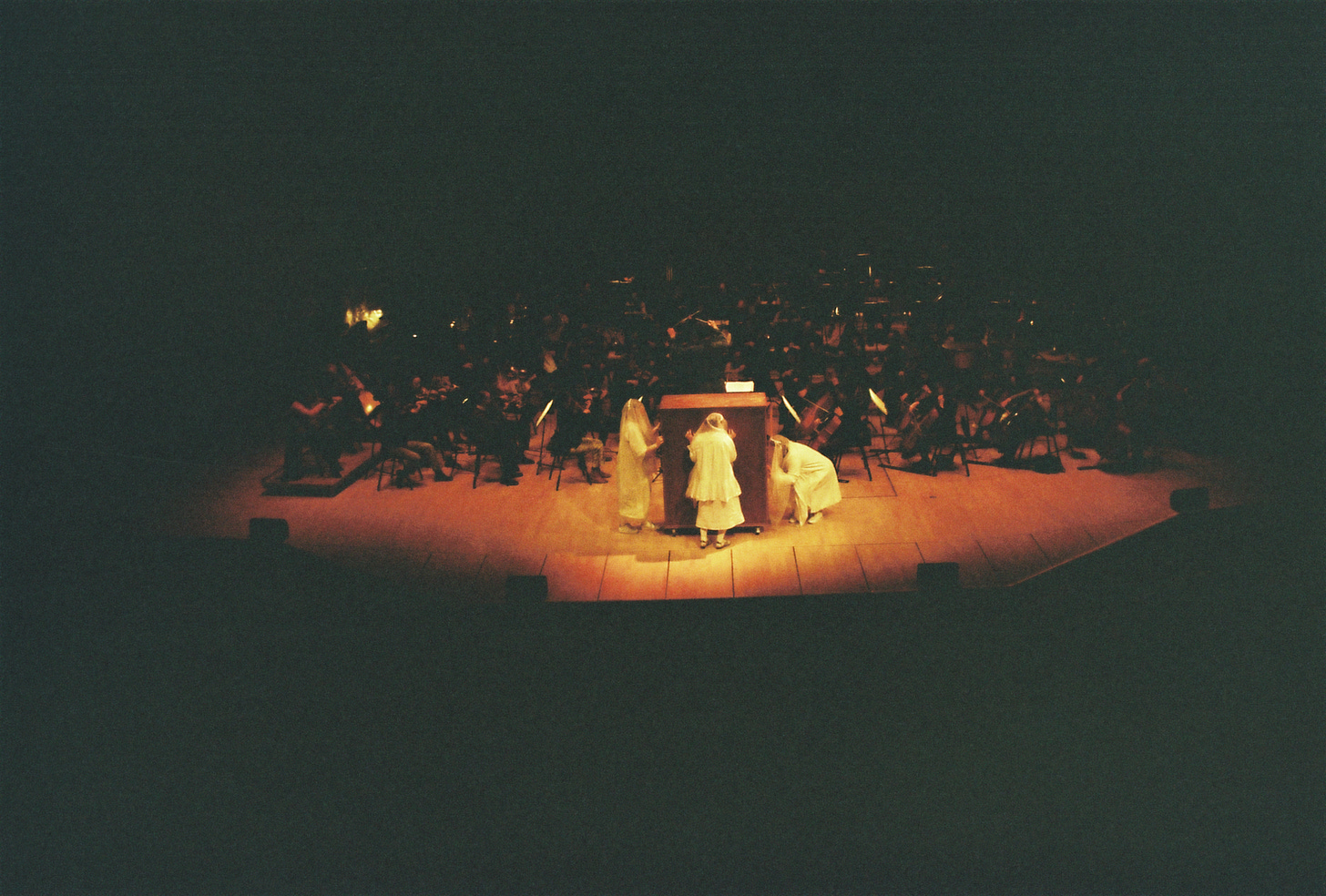 Music began again. They played Mazzolis Orpheus Undone pt 2. I had made a little choreography so me and the performers would walk up and down on both sides of the orchestra, blessing them, as if we were the air in two lungs, going up and down. In this choreography I slipped out of a door in the back changing places with the soprano. From here I ran up to the light booth.