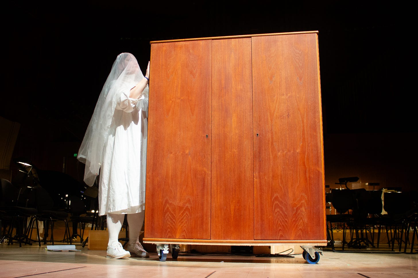 We rolled the closet onto the stage during intermission. But it was not a wardrobe then, it was a secrets compartment for everyone to project their own images on. I found it very ticklish that from the floor seats it would block the view of the conductor.