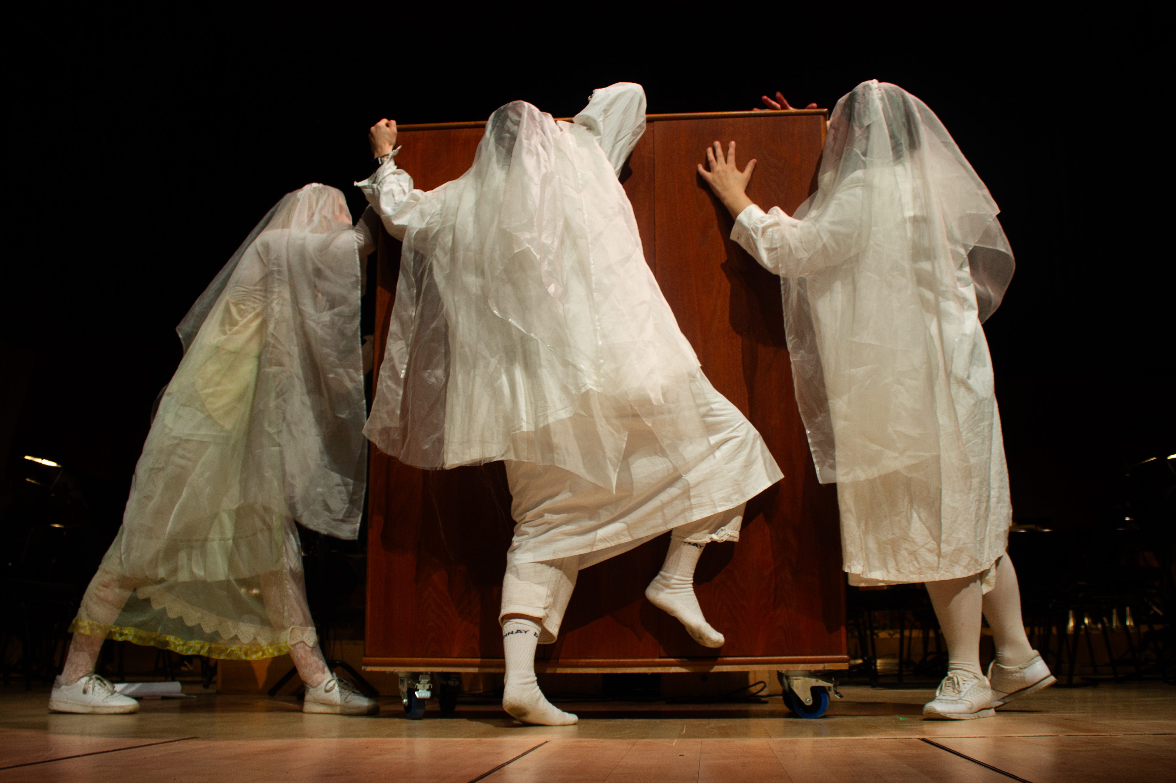 In our (albeit short) rehearsal time, to my surprise the performers developed a sensual, dare I say erotic, VERY HOT relationship to the wardrobe. They came to feel ownership over different “parts” of the wardrobe, they named their time with the closet a “make out session”, that talked about impregnating it.