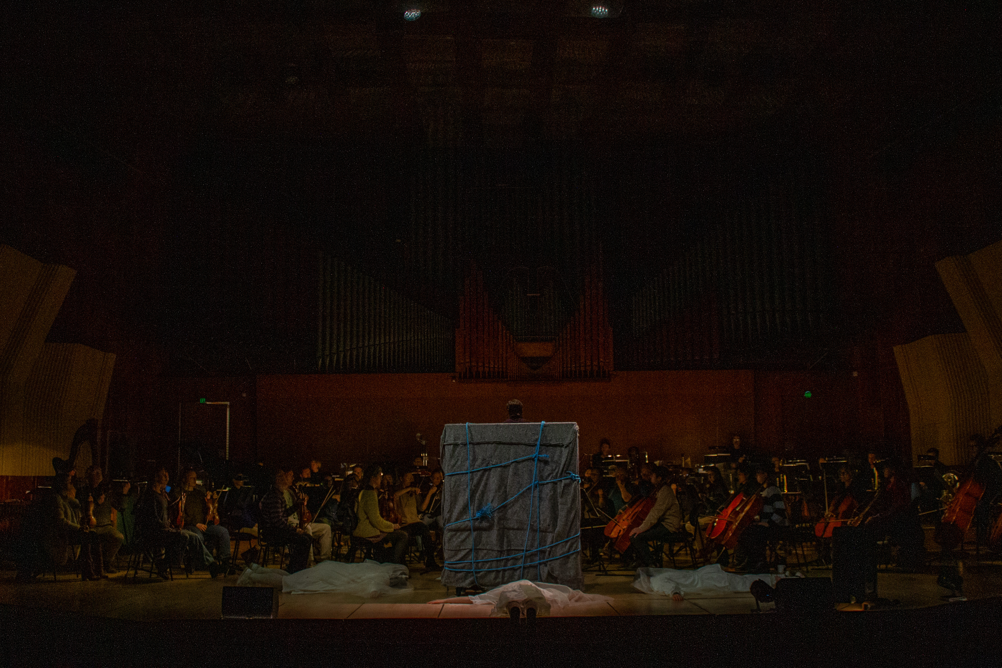 We transitioned into a short piece of Hildegard Von Bingen, O rubor sanguinis, with only Marlenes voice and a low drone from the double basses. The room feel completely dark and we again projected the stone on the organ.