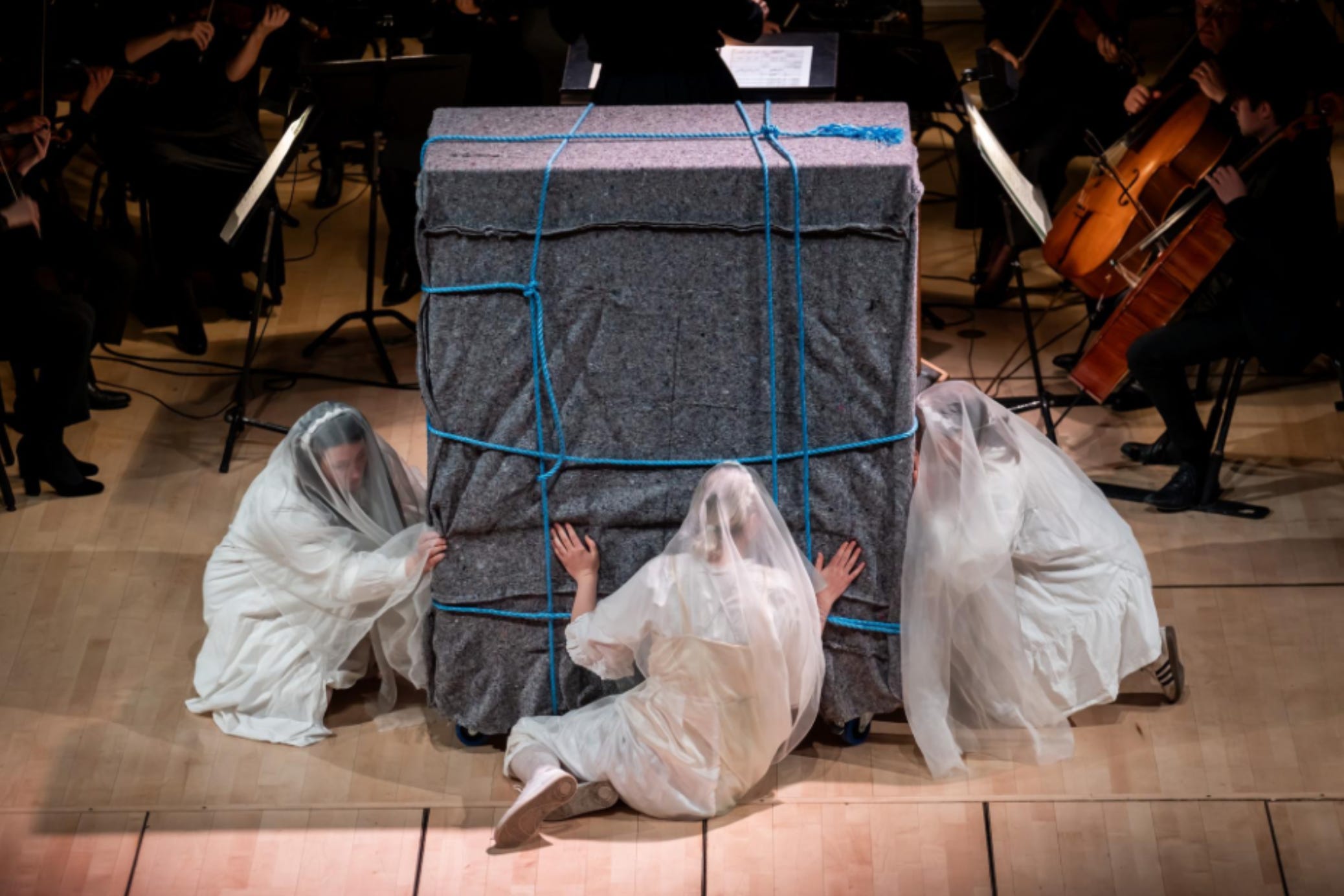 Around 17 minutes into the Firebird the priestesses undressed the wardrobe. I was very surprised by the feeling in the room, I think the priestesses were too. I think we perhaps had anticipated somekind of displaced laughter, disappointment perhaps og disapproval, confusion? We had spent the last 20 minutes in intense charging of the shapeless mass and now the reveal was that it was just a wardrobe. But it was is if the release of the reveal never came. The audience was still holding its breath, waiting, in complete seriousness. I crouched unter the light booth biting my fist. I was so incredibly nervous. I can’t say exactly why. My guess is that it was because I was really risking something. Having some women lye around a soprano in a nice image, thats FINE, that’s DANDY, that’s not dangerous. But now doing this, charging this secret object to reveal it was just a closet. It felt CRAZY. It also was exactly what I wanted. What I BELIEVE. To give the non-human object this space, this adoration, to make all the dramatic, swelling music to be about FURNITURE. The deep tenderness for the object. And through the tenderness for the object af deep tenderness for the material world, our ecology.